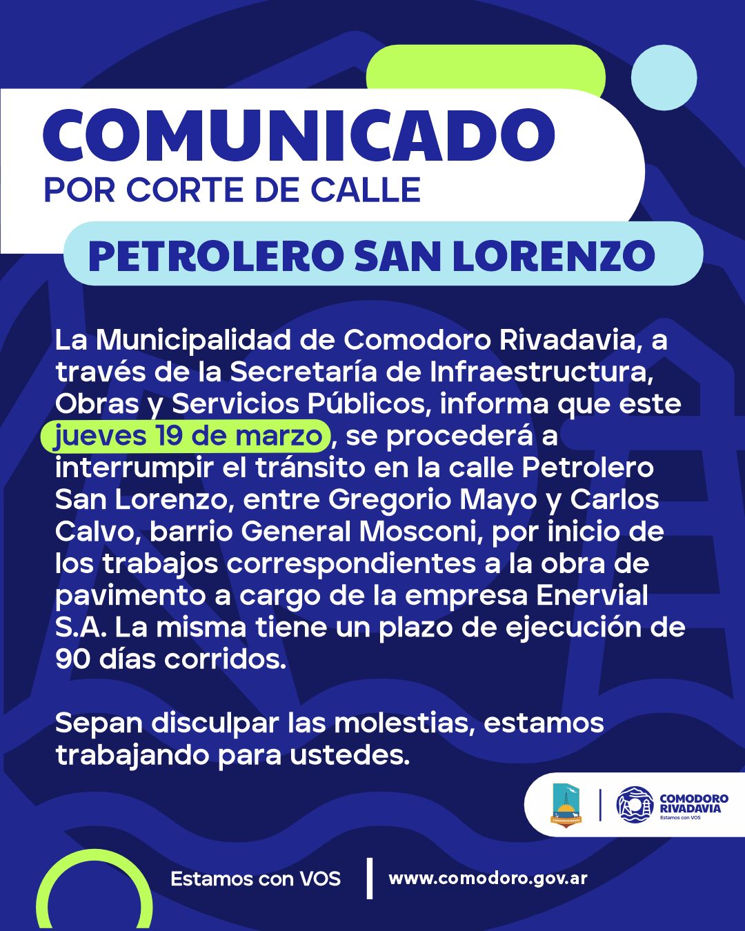 La Municipalidad de Comodoro Rivadavia, a través de la Secretaría de Infraestructura, Obras y Servicios Públicos, informa que este jueves 19 de marzo, se procederá a interrumpir el tránsito en la calle Petrolero San Lorenzo, entre Gregorio Mayo y Carlos Calvo, barrio General Mosconi, por inicio de los trabajos correspondientes a la obra de pavimento a cargo de la empresa Enervial S.A. La misma tiene un plazo de ejecución de 90 días corridos.