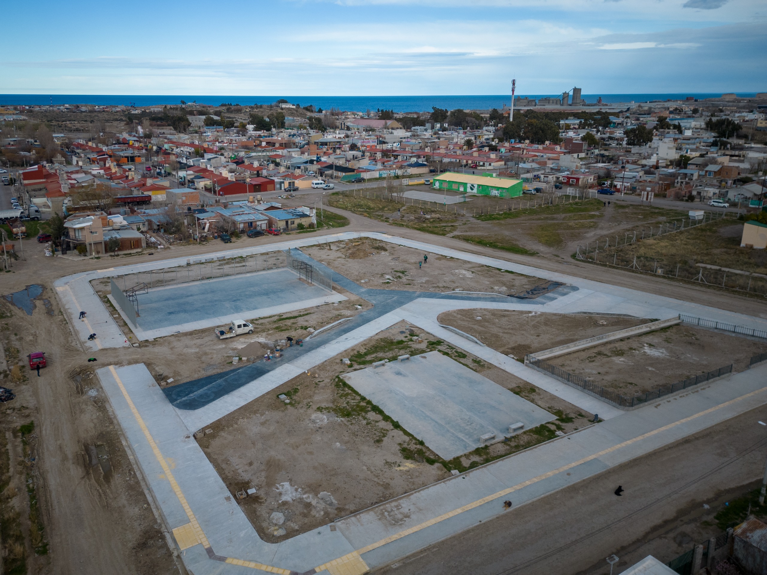 En cuanto a la infraestructura de hormigón, se avanzó con la construcción de las bases para los distintos elementos de la plaza, los cordones perimetrales y la ejecución de un playón deportivo diseñado para múltiples actividades.