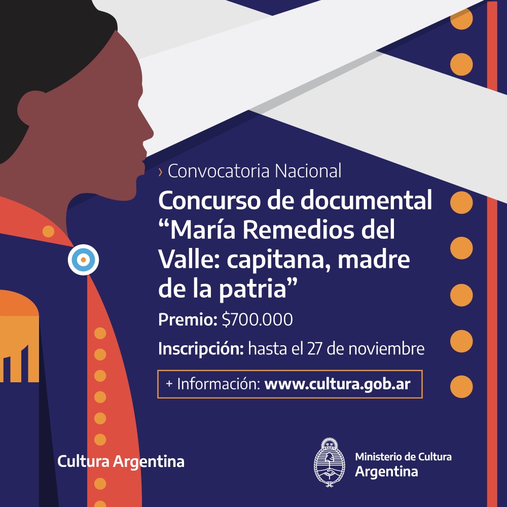 La Secretaría de Ciencia, Tecnología Innovación Productiva y Cultura del Chubut informa que el Ministerio de Cultura, a través de la Dirección Nacional de Innovación Cultural dependiente de la Secretaría de Desarrollo Cultural, lanza el Concurso Nacional de Documental «María Remedios del Valle: Capitana, Madre de la Patria», un certamen audiovisual que tiene como objetivos la visibilizarían y reconocimiento de la figura de María Remedios del Valle, así como la promoción y el fortalecimiento de la producción audiovisual argentina.