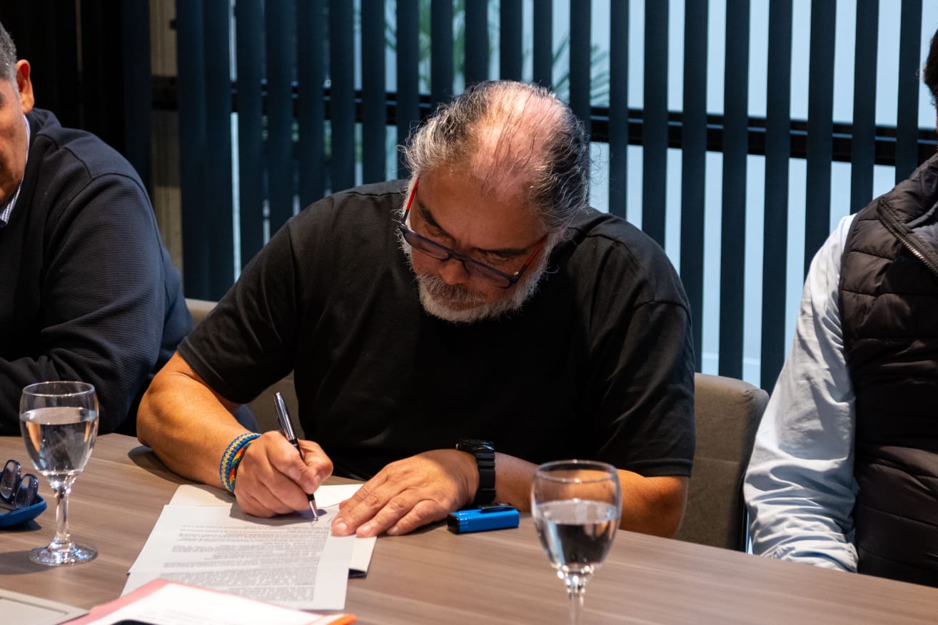 Este jueves, se concretó la firma correspondiente a las últimas paritarias del año 2025 en un acto que contó con la presencia del intendente Othar Macharashvili; el viceintendente Maximiliano Sampaoli; el secretario de Gobierno, Sergio Bohe; el titular de la cartera de Economía, Fernando Barría; el responsable del área de Control Urbano y Operativo, Miguel Gómez; el secretario de Desarrollo Humano y Familia, Ángel Rivas; el subsecretario de Recursos Humanos, Miguel Montoya; y los secretarios generales del Sindicato de Obreros y Empleados Municipales y de la Asociación del Personal Jerárquico Municipal, Omar Unquén y Roberto Astete, respectivamente.