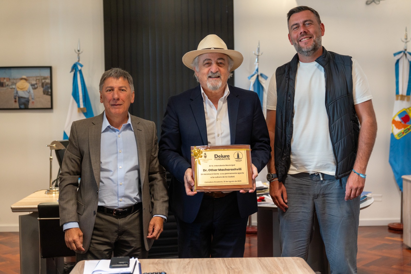 Este viernes el intendente Othar Macharashvili se reunió con el presidente de la Fundación Deiure, Aldo Chinni y el presidente de Fundación del Golfo, Víctor Bonzano, durante el encuentro se abordaron temáticas referidas al Congreso Patagónico de Derecho Civil y Comercial que se realizó en nuestra ciudad el pasado 21, 22 y 23 de agosto.
