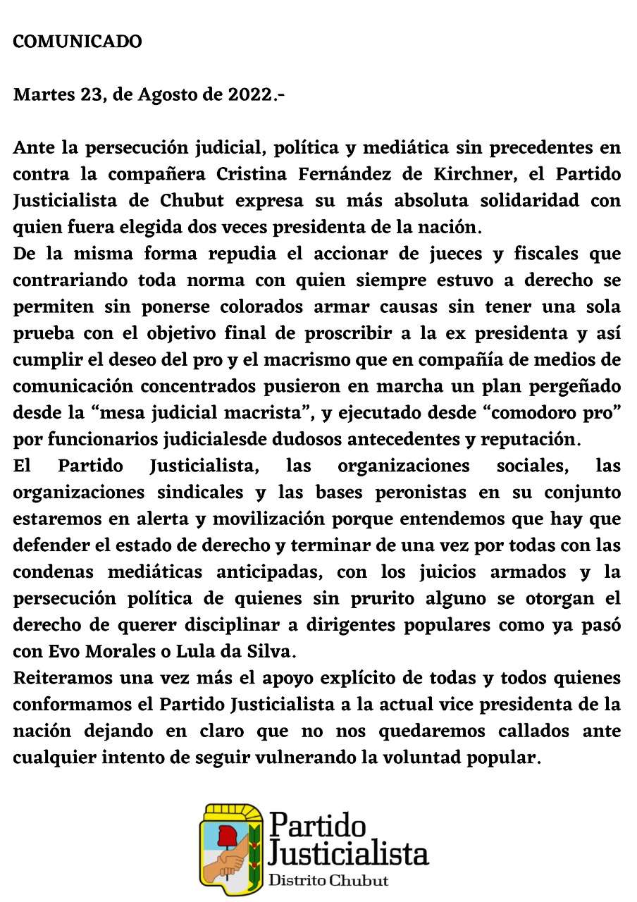 A través de un comunicado, acto y movilización, el Partido Justicialista expresó su absoluta solidaridad con quien fuera elegida dos veces presidenta de la nación y también repudió el accionar de jueces y fiscales, por armar causas sin tener una sola prueba con el sólo fin de proscribir a la ex presidenta.