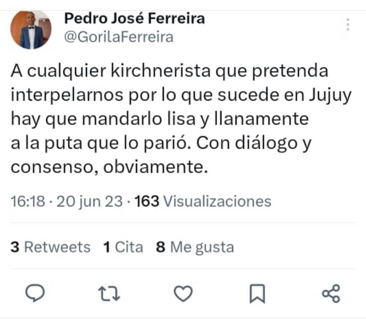 Otro abogado del estudio FdlC: es Pedro Ferreira de las Casas, conocido y autodenominado en Twitter como @gorilaferreira. Sus discursos de odio son propios de la ideología anti democrática que sostiene y representa.