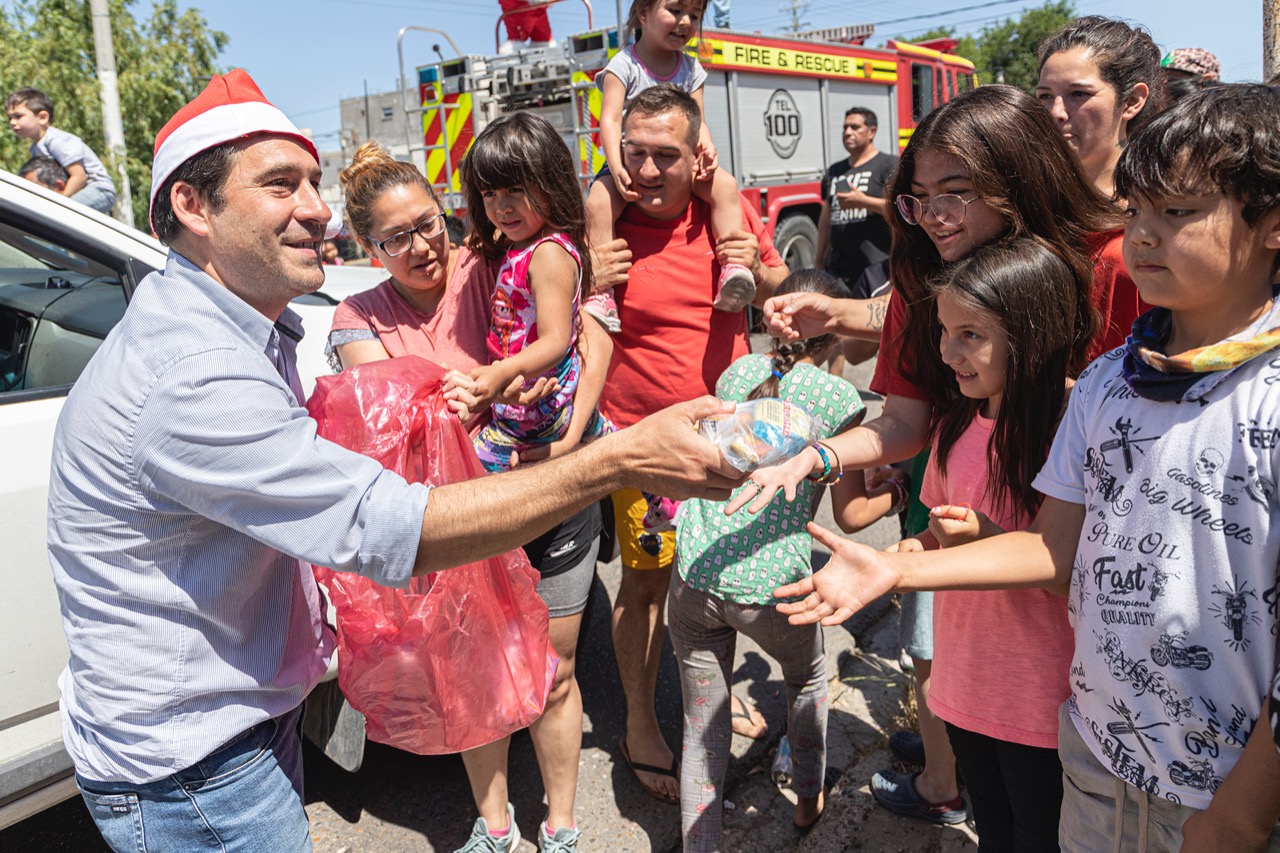 En el marco del recorrido de Papá Noel por la ciudad, que se desarrolló este jueves al mediodía, el intendente Juan Pablo Luque repartió golosinas en los barrios y brindó unas palabras a la comunidad con un mensaje de paz y destacando la pujanza de la ciudad.