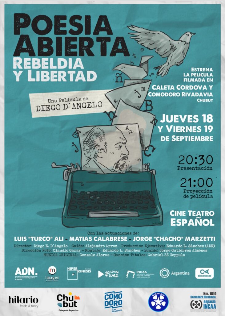 Los días jueves 18 y viernes 19 de septiembre se exhibe el film documental realizado por el cineasta Diego D’Angelo que aborda la historia del ciclo “Poesía Abierta”, un espacio cultural creado por el poeta Daniel Giribaldi que funcionó en Buenos Aires entre 1982 y 1996. El ciclo reunió a artistas de diferentes disciplinas en bares de San Telmo, donde se presentaban lecturas de poesía. Entre los participantes se encontraron figuras como Horacio Ferrer, Alejandro Dolina, Teresa Parodi y Federico Luppi. D’Angelo, quien además de dirigir la película es periodista, encontró el material que sirve de base para el documental: una película en Súper 8, grabaciones y fotos del ciclo que se creían perdidas. Se incluyen, además, escenas filmadas en Caleta Córdova. El director ofrecerá una presentación a las 20:30 Hs. y la proyección comenzará a las 21:00 Hs.