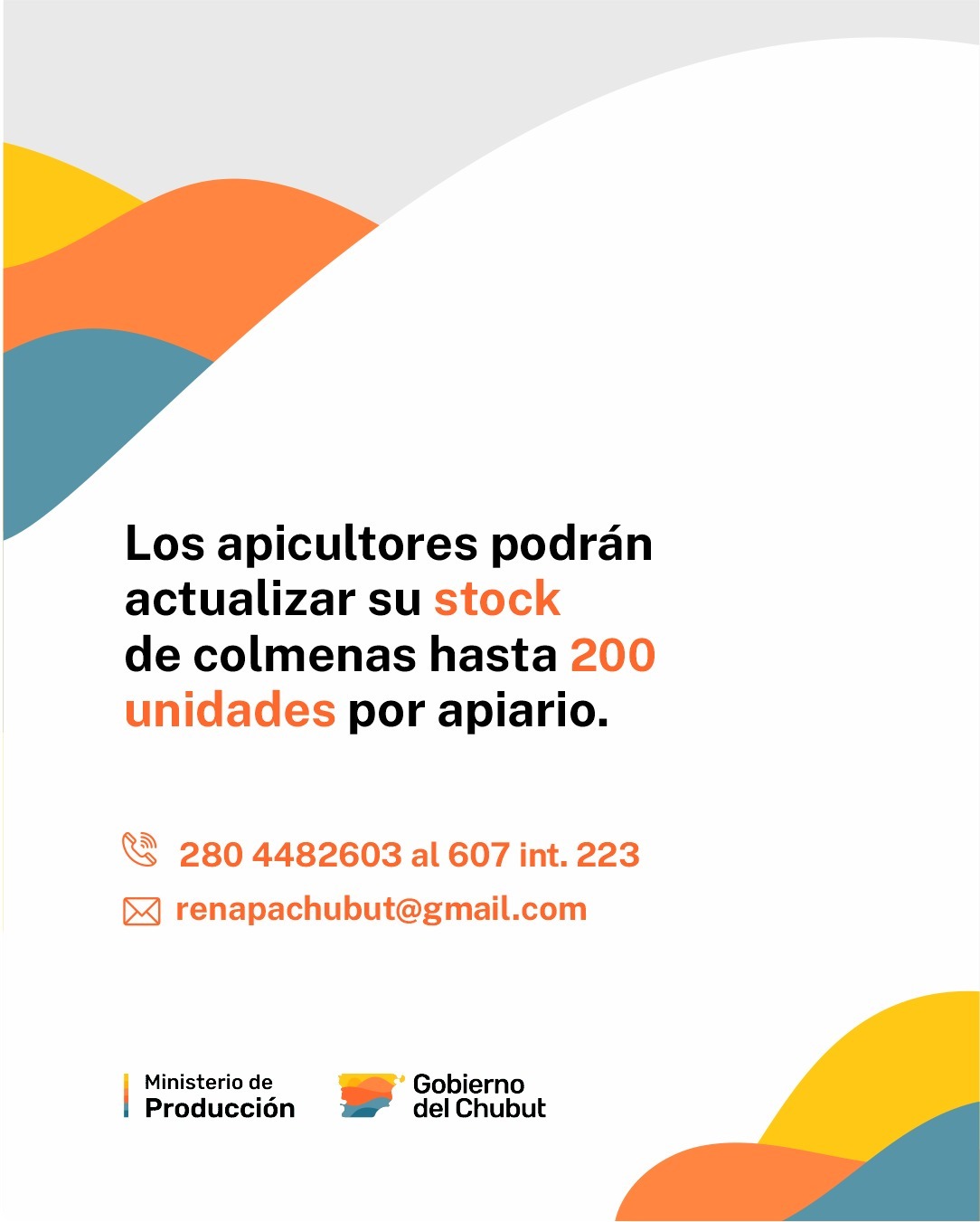 El Gobierno del Chubut convoca, a través del Ministerio de Producción, a los productores apícolas de la provincia a inscribirse en el Registro Nacional de Productores Apícolas (RENAPA) y a quienes ya lo están, a actualizar la cantidad de colmenas por apiario hasta el 1 de julio de este año.