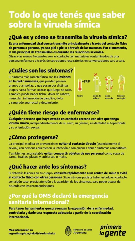 La principal medida de prevención es evitar el contacto directo (incluido el sexual) con personas que tienen la infección o síntomas compatibles de viruela (fiebre, decaimiento, ganglios inflamados, lesiones en piel como vesículas/costras).